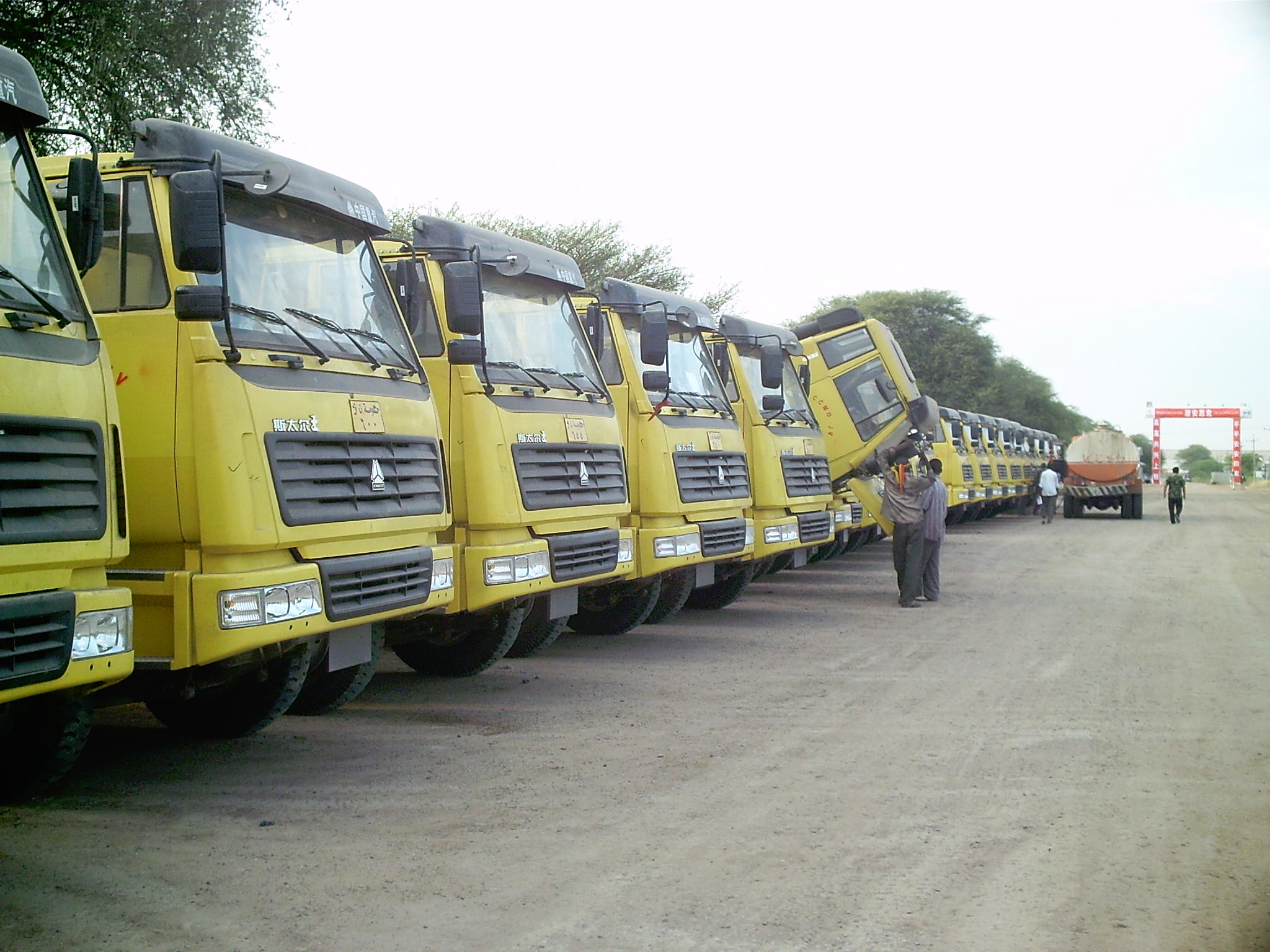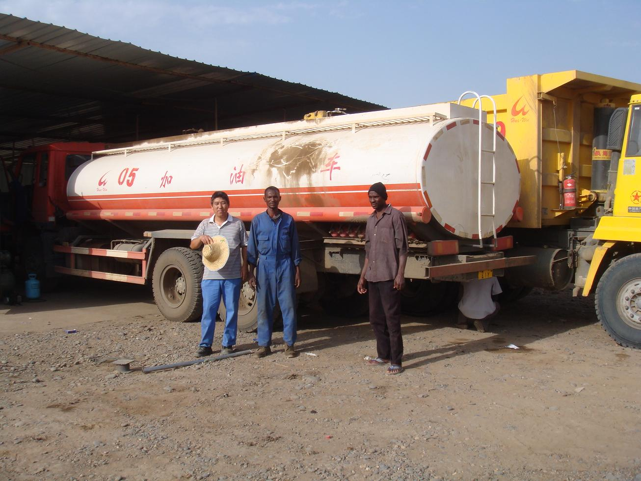 蘇丹-羅塞雷斯大壩加高項(xiàng)目,2009年 4月27日喀土穆當(dāng)?shù)貢r(shí)間中午12點(diǎn),中國(guó)水利水電建設(shè)集團(tuán)公司和中國(guó)水利電力對(duì)外公司組成的CCMD聯(lián)營(yíng)體與蘇丹大壩運(yùn)行管理局(DIU)在象征著中蘇友誼的“友誼廳”舉行了羅塞雷斯(Roseires)大壩加高項(xiàng)目施工合同的簽字儀式。。巴希爾總統(tǒng)、水利灌溉部長(zhǎng)奧薩馬、財(cái)政部長(zhǎng)賈茲、中國(guó)駐蘇丹大使李成文等發(fā)表了熱情洋溢的講話。中國(guó)水電集團(tuán)總經(jīng)理范集湘、中國(guó)水電對(duì)外公司總經(jīng)理陸國(guó)俊和蘇丹水利灌溉部部長(zhǎng)兼DIU局長(zhǎng)奧薩馬分別代表各方在合同書上簽字。購買我司產(chǎn)品共計(jì)129輛專用車輛:20T重汽斯太爾自卸車110輛、20立方灑水車10輛(具有簡(jiǎn)單的消防功能)、吸糞車4輛、5T載貨車。下面是售后服務(wù)人員與當(dāng)?shù)鼐S修技術(shù)人員在一起。