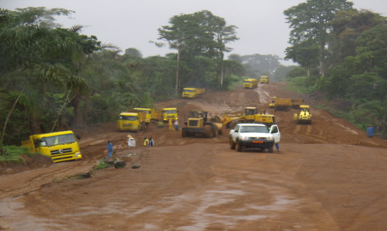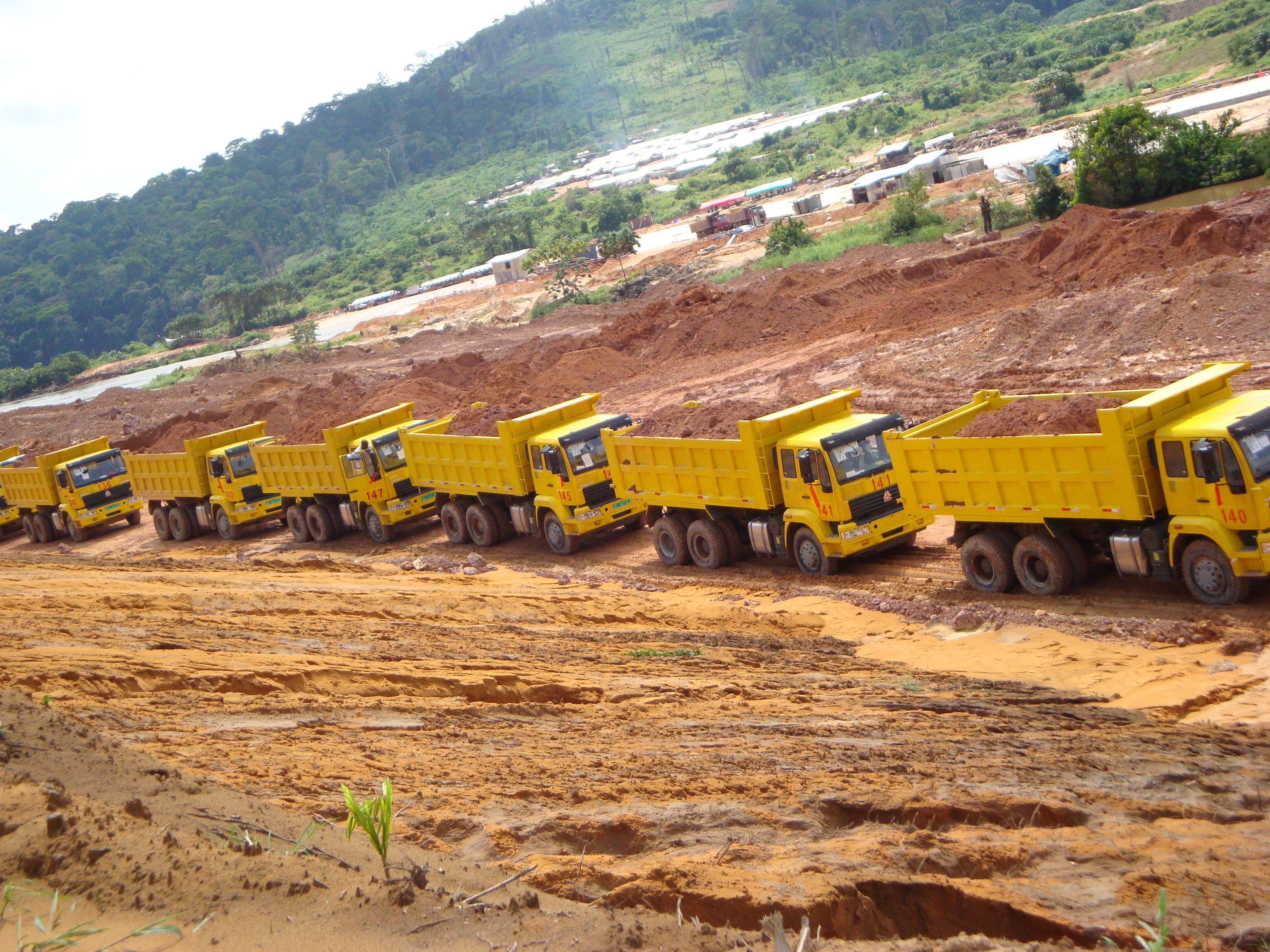 喀麥隆芒菲項(xiàng)目工程,喀麥隆巴舒奧.阿卡貝—芒菲—??瓶斯氛喂こ添?xiàng)目位于喀麥隆西南邊境。該項(xiàng)目合同金額為39,620,358,026FCFA(西非法郎)折合8550萬美元,含稅金額為10711萬美元。工期從2010年2月23日起算為36個(gè)月。土石方開挖回填量共計(jì)4,568,838m3左右。該項(xiàng)目購買我公司車輛設(shè)備如下:隨車吊3臺(tái),混凝土攪拌運(yùn)輸車5臺(tái),自卸車40臺(tái),10噸自卸車10臺(tái),8噸長(zhǎng)貨5臺(tái),半掛車及牽引車1臺(tái),油罐車2臺(tái),灑水車6臺(tái)共73臺(tái)。下面是我公司生產(chǎn)的大力神自卸車在喀麥隆芒菲項(xiàng)目部施工現(xiàn)場(chǎng)。
