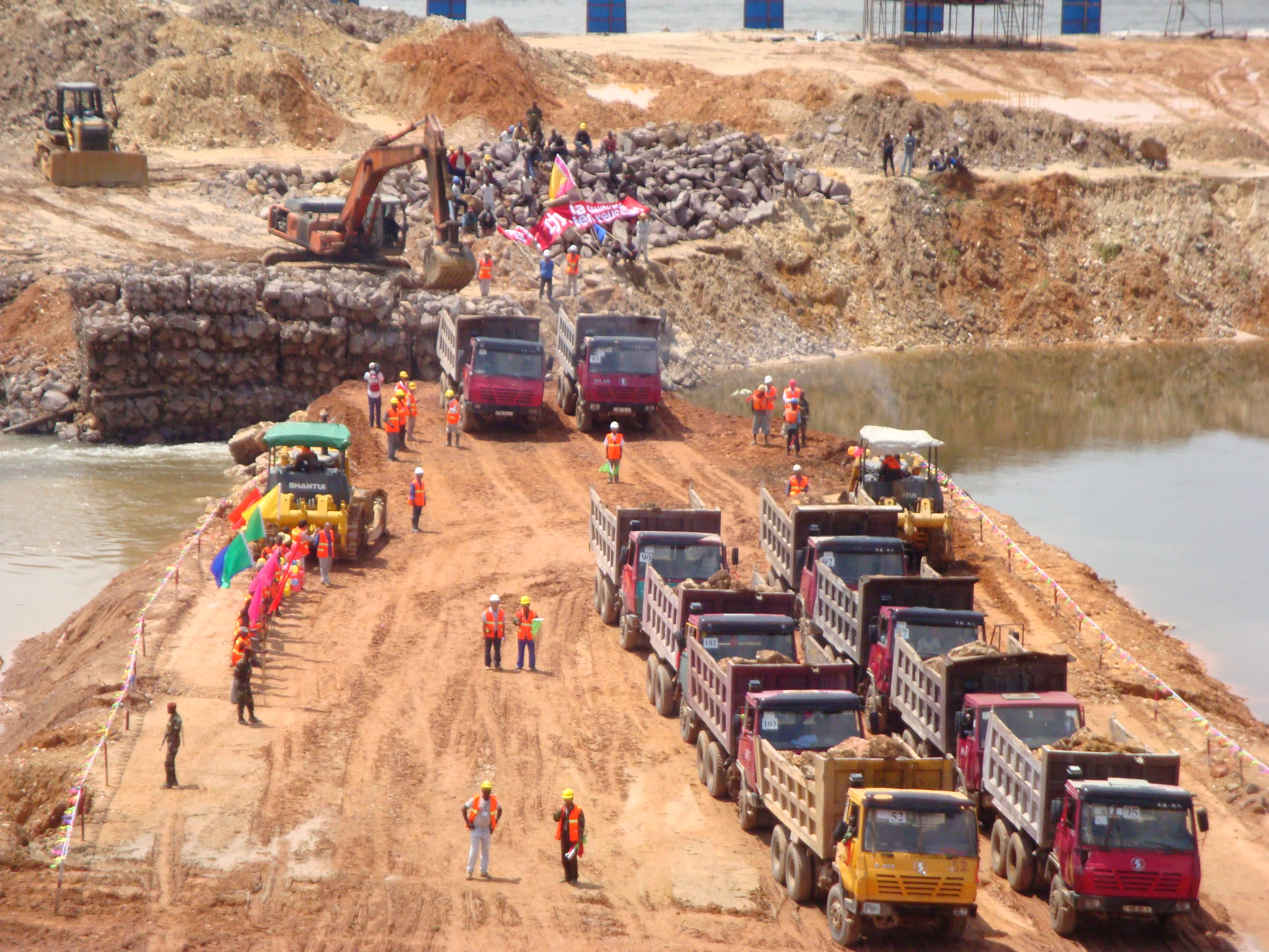 加蓬-布巴哈水電站項(xiàng)目,布巴哈電站裝機(jī)規(guī)模為160Mw,合同金額約為:4億美元,工程開工時(shí)間為2008年11月15日,2013年4月25日完工,總工期約54個(gè)月,2009年4月我公司與中國(guó)水電集團(tuán)簽訂了1780萬元的車輛供貨合同,主要有大力神自卸車、灑水車、加油車、混凝土攪拌運(yùn)輸車等共計(jì)77輛,出色的品質(zhì)及良好的售后服務(wù)深受用戶好評(píng)。我公司生產(chǎn)的大力神20T自卸車及重汽豪濼自卸車截止2010年底主要完成工程量(擋水大壩、取水口、引水道 、調(diào)壓井 、地面明廠房出渣):土方明挖403599.7m3,石方明挖212390.6m3,石方洞挖95019.4m3,土石方填筑169476.2m3,礫石料填筑51032.1m3。奧果韋河大壩截流現(xiàn)場(chǎng)我公司生產(chǎn)的25T自卸車發(fā)揮著巨大的作用。