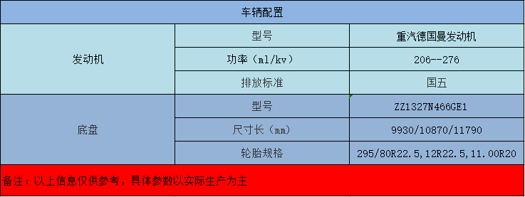 重汽德國(guó)曼發(fā)動(dòng)機(jī),7T-9T前橋,13T-16T后橋。